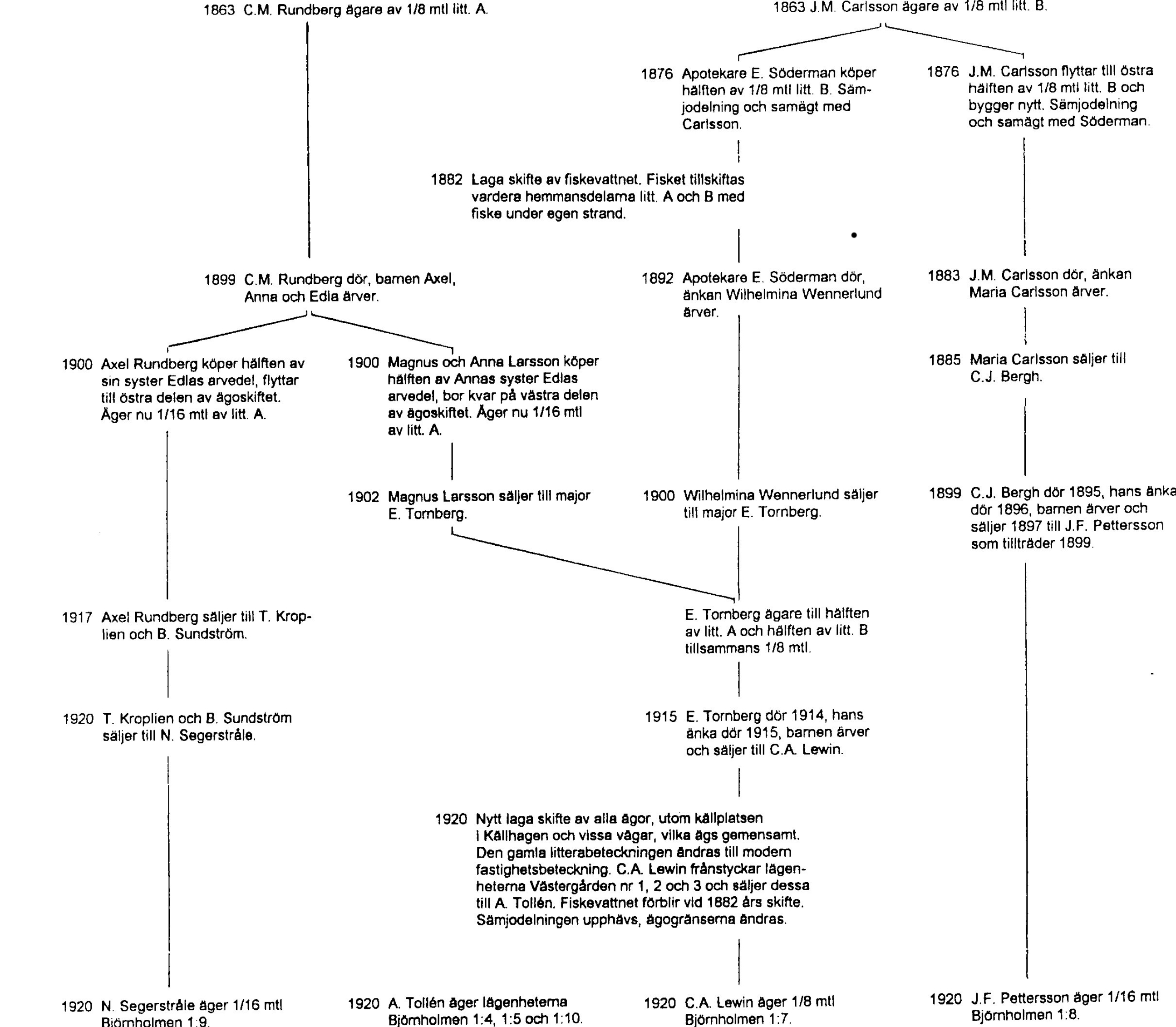 Gränsen mellan de båda halvorna av littera B var ej heller fastställd av ägodelningsrätten, utan gick tillbaka på den sämjodelning som skedde 1876 då Carlsson sålde hälften av sin fastighet littera B till apotekare Söderman. Levins avsikt var att genom denna förrättning få sådana gränser utstakade, att hans 1/8 mtl också motsvarades av Björnholmens halva areal.