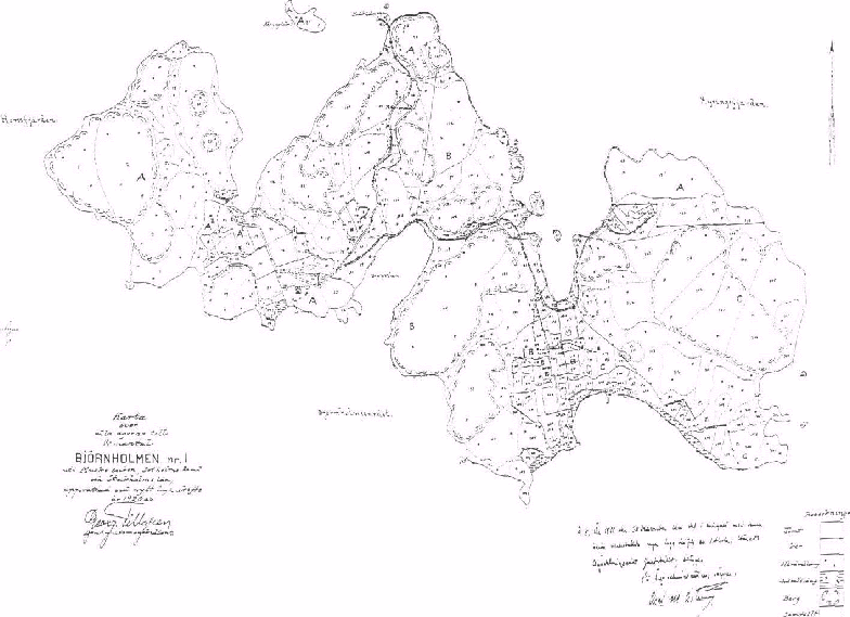 Att Björnholmen 1:8 och 1:9, vardera 1/16 mtl, ej har samma areal förklaras av den åsatta graderingen av marken, där t ex skogsmarkens produktivitet kan variera avsevärt, varför jämkningar görs med större areal för sämre mark. En översikt av ägareförhållandena för tiden mellan de båda laga skiftena visas på bilden nedan.